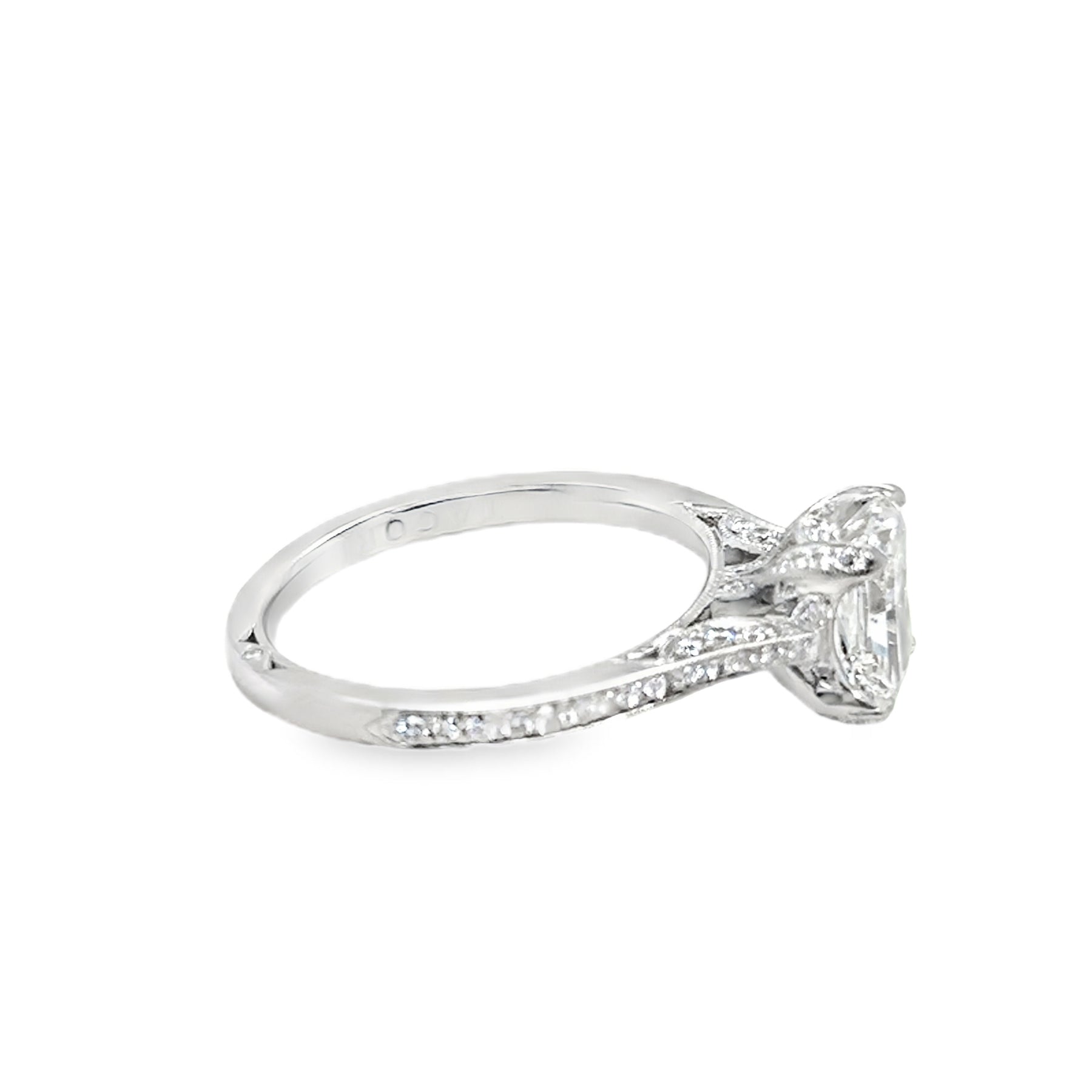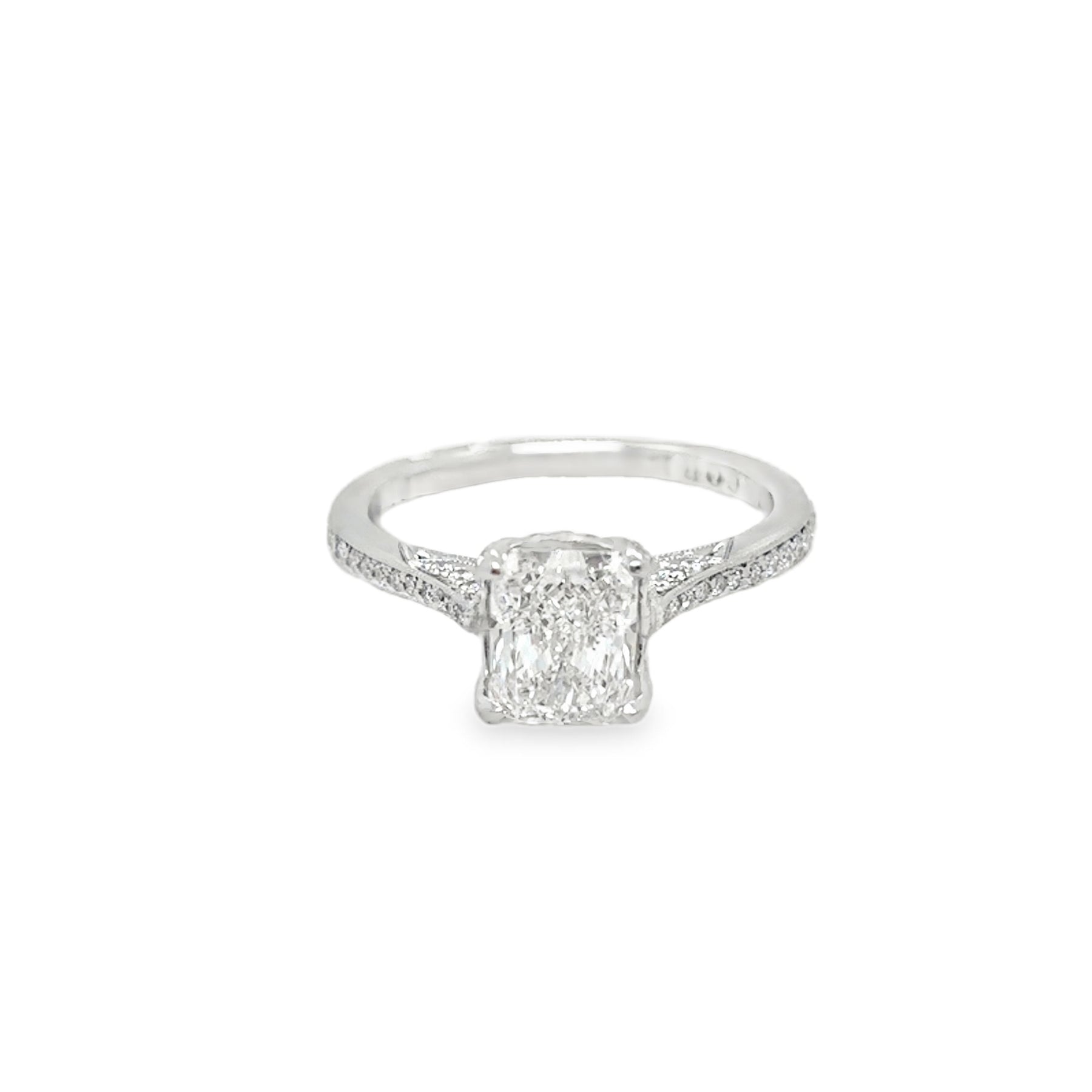 This stunning Tacori ring features a 1.20-carat radiant-cut diamond certified by GIA with G color and SI2 clarity, offering excellent brilliance and value. Crafted in platinum, this precious metal provides superior durability and a naturally white luster that complements the diamond's sparkle. Tacori's signature design elements deliver sophisticated elegance with refined detailing. The radiant cut combines the geometric precision of an emerald cut with the light-reflecting facets of a brilliant cut, creating a distinctive sparkle. An ideal choice for those seeking a high-quality diamond with timeless appeal and expert craftsmanship.