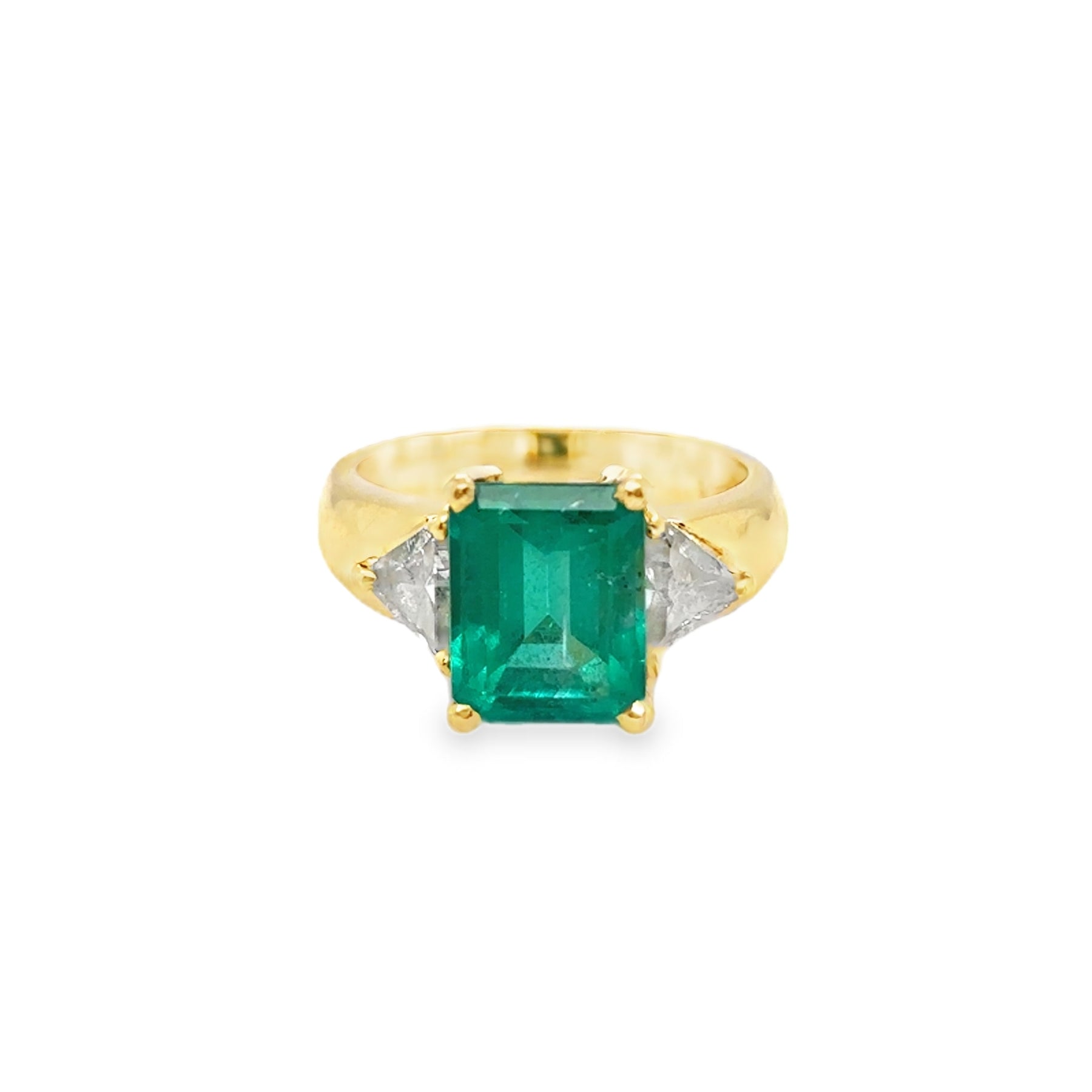 This sophisticated 18K yellow gold ring showcases a stunning 3.5-carat emerald cut emerald as its centerpiece, complemented by 0.66 carats of brilliant trillion-cut diamonds flanking either side. The emerald cut's clean lines and step facets highlight the stone's rich color and clarity, while the triangular diamond accents add sparkle and dimension. Crafted in premium yellow gold, this design balances classic elegance with contemporary flair, making it an exceptional choice for engagement rings or significant milestone celebrations.