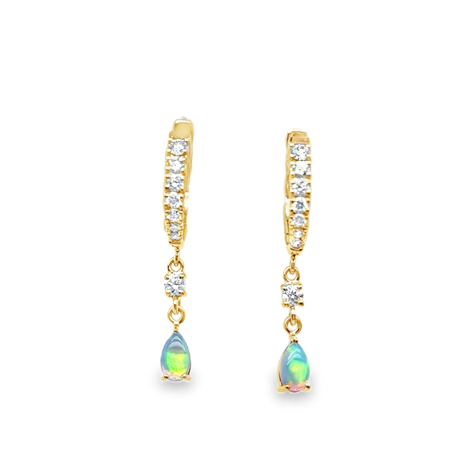 • Elevate your everyday elegance with these exquisite 14K gold huggie drop earrings, featuring a stunning 1.22 carat opal as the centerpiece. The opal's mesmerizing play of color is complemented by 0.28 carats of sparkling diamonds, creating a sophisticated interplay of light and brilliance. The "Esperansa" design combines the comfort and security of a huggie closure with the graceful movement of a drop silhouette, making these earrings ideal for both special occasions and refined daily wear. Crafted in 14K gold for lasting durability and timeless appeal.