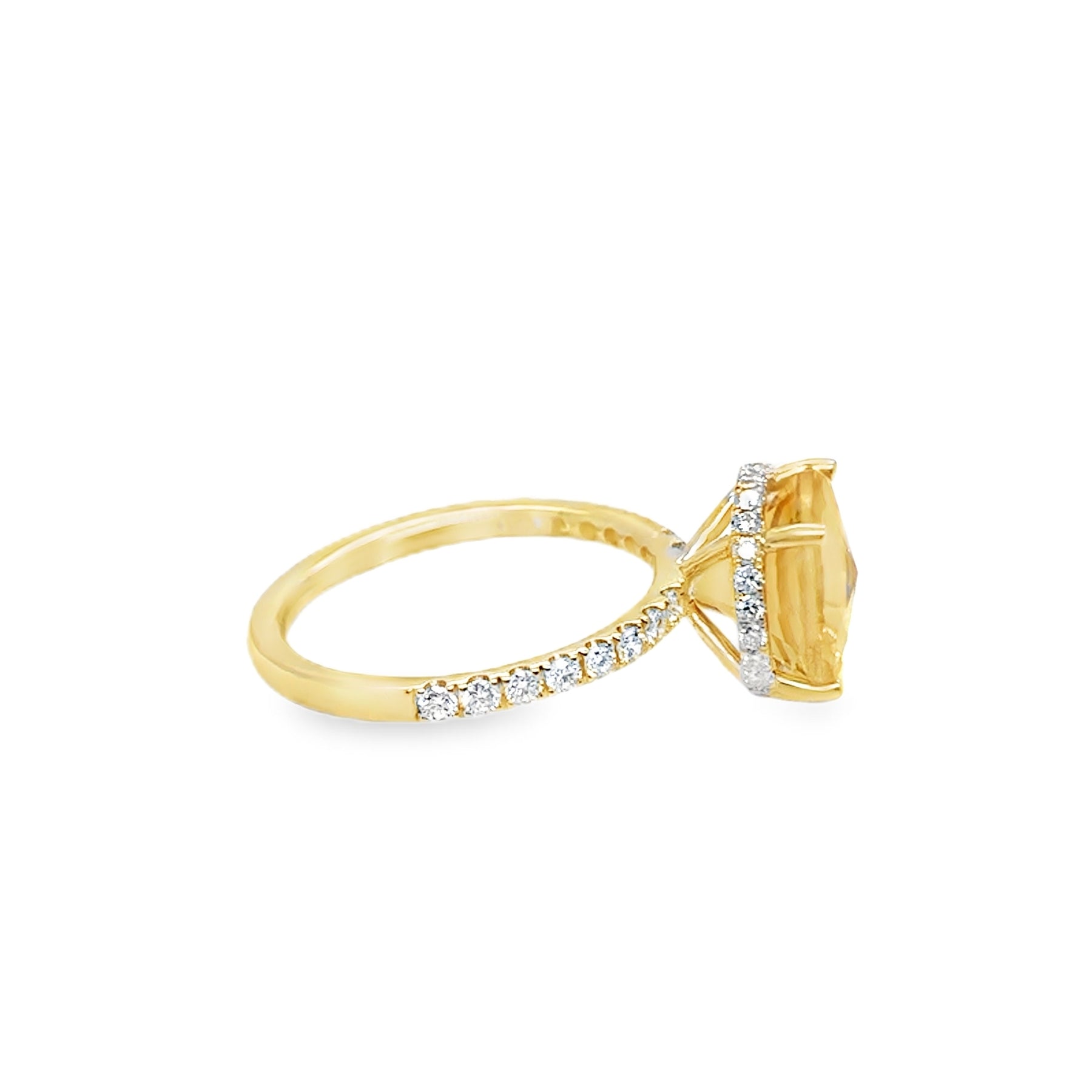 Radiant citrine takes center stage in this sophisticated 14K yellow gold ring, showcasing a stunning 0.66-carat gemstone. The hidden halo design features 0.57 carats of brilliant diamonds nestled beneath the citrine, amplifying sparkle while maintaining an elegant, streamlined silhouette. This expert craftsmanship combines the warm, golden hues of citrine with the timeless brilliance of diamonds, creating a piece that balances contemporary design with classic appeal. Perfect for those seeking a distinctive engagement ring or meaningful everyday luxury.