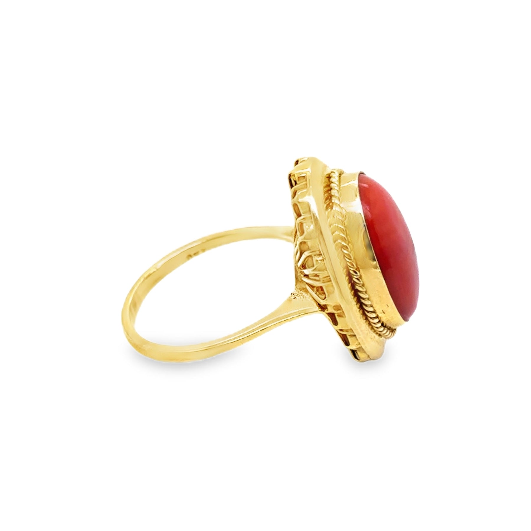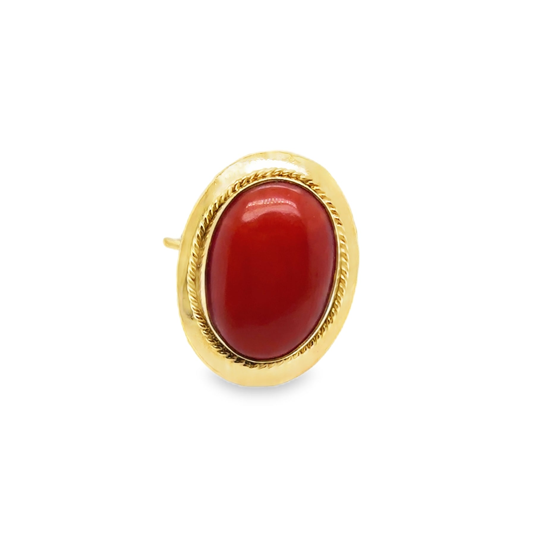 This elegant 18K yellow gold ring features a stunning coral stone set in a classic bezel setting. The secure bezel design protects the coral while allowing light to enhance its warm, natural hues. Crafted with precision and refined aesthetics, this piece combines timeless sophistication with the organic beauty of coral. Perfect for those who appreciate fine jewelry with distinctive character and enduring style.
