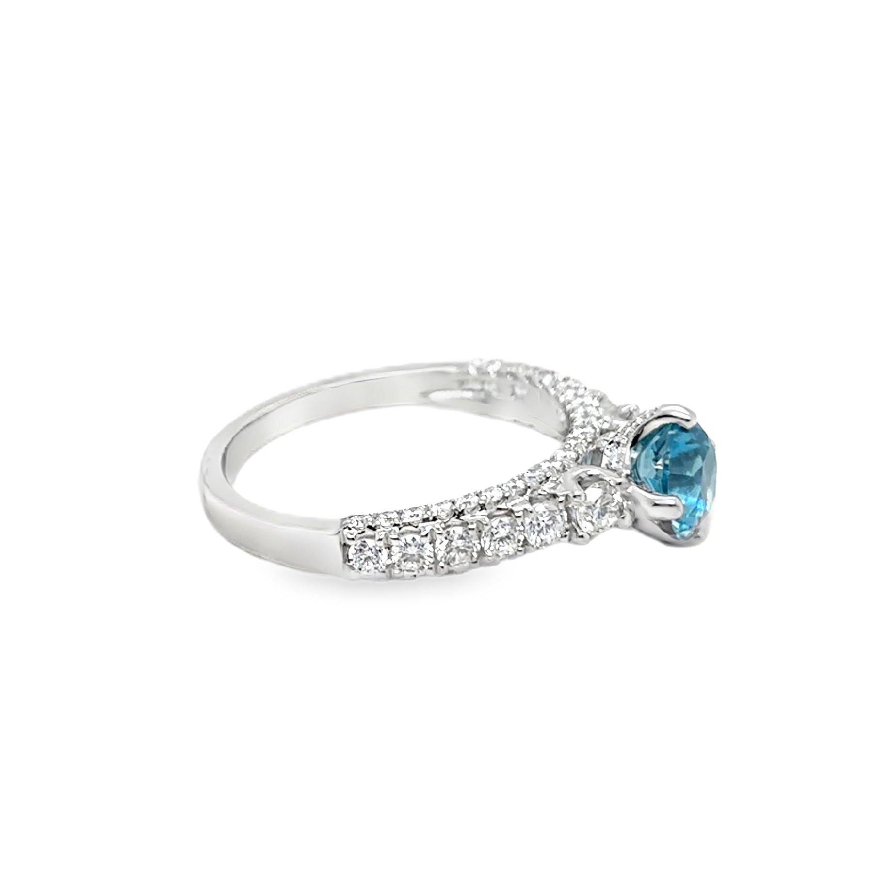 • This elegant 14K white gold ring showcases a stunning 1.32-carat blue zircon as its centerpiece, complemented by sparkling diamonds that enhance its brilliance. Blue zircon's rich, captivating hue and exceptional clarity make it a distinctive choice for those seeking something beyond traditional gemstones. The diamond accents provide timeless sophistication and amplify the stone's natural radiance. Expertly crafted in white gold, this ring combines luxury with refined elegance, making it an ideal choice for engagements, anniversaries, or as a treasured personal keepsake.