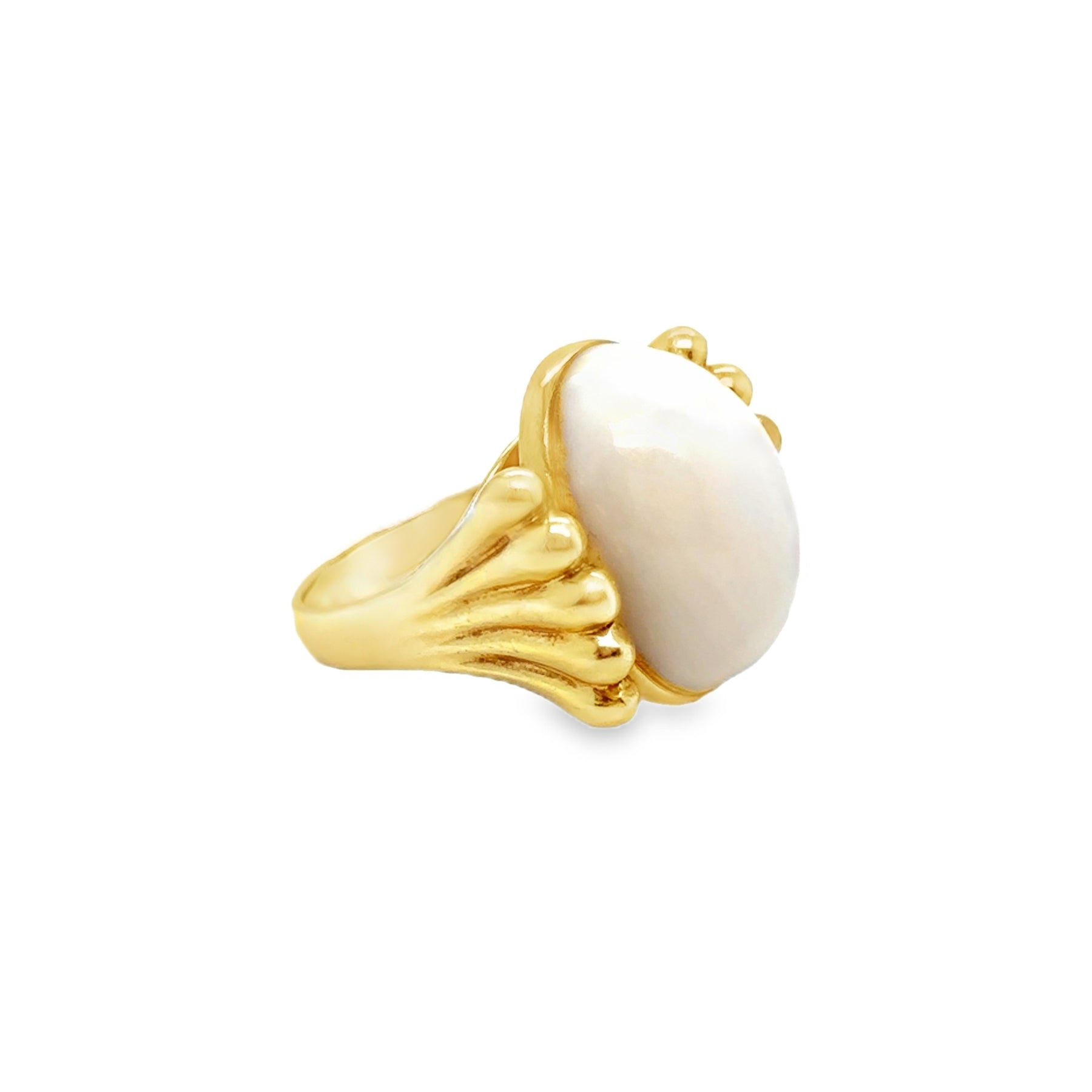 Crafted in 18-karat yellow gold, this ring showcases a luminous cream coral stone that radiates warmth and sophistication. The delicate hue of cream coral offers a refined alternative to traditional gemstones, making it an ideal choice for those seeking understated elegance. The precious metal setting ensures durability and longevity, while the stone's natural beauty serves as a striking focal point. Perfect for everyday wear or special occasions, this piece combines timeless design with contemporary appeal.