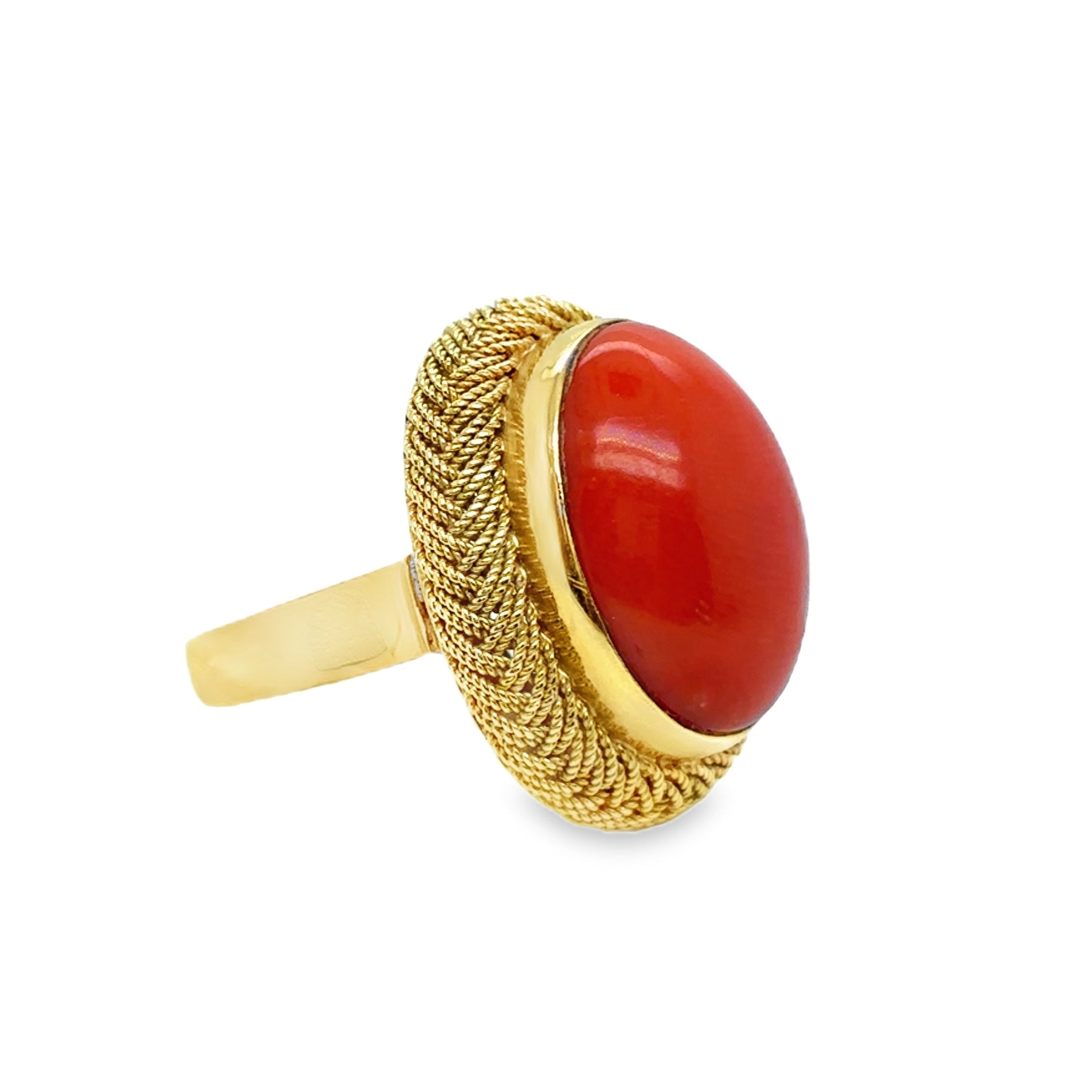 Crafted in 18-karat yellow gold, this mid-century inspired ring showcases a striking coral stone set within an intricately woven bezel. The detailed metalwork reflects the sophisticated design sensibilities of the era, while the warm coral hue complements the rich gold tone. A timeless piece that merges vintage aesthetics with refined craftsmanship, perfect for collectors who appreciate distinctive gemstone jewelry with historical design influence.