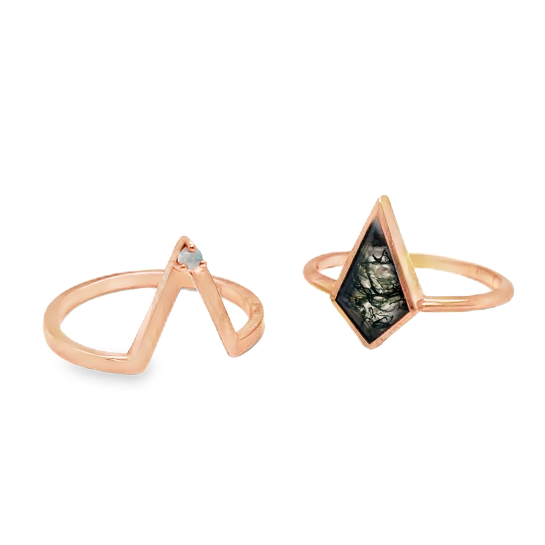 This exquisite 14K rose gold ring set features a moss agate centerpiece paired with a complementary matching band, both highlighted by delicate opal accents. The moss agate offers unique, natural patterns that evoke a connection to nature, while the opal adds a subtle iridescent glow for enhanced elegance. Crafted with precision, this set balances organic charm with refined craftsmanship, making it an exceptional choice for those who appreciate distinctive and meaningful jewelry.