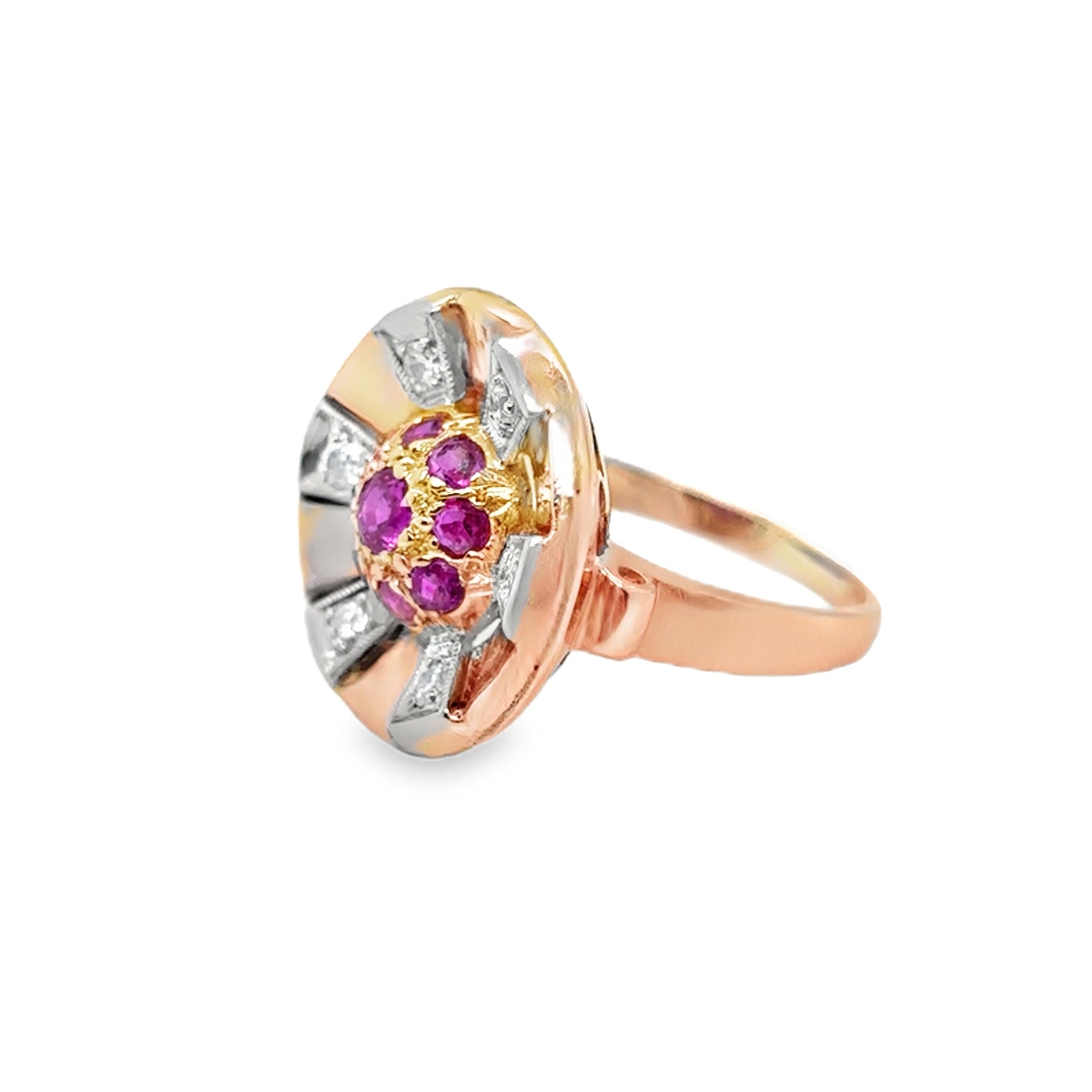 This stunning estate cocktail ring showcases the timeless elegance of the Retro era. Featuring a vibrant .70 carat ruby as the centerpiece, complemented by .30 carats of sparkling diamonds, this 14K rose gold piece exemplifies vintage craftsmanship and enduring style. The sophisticated design captures the glamour of mid-century jewelry, making it an exceptional choice for collectors and those seeking a distinctive statement ring. Sized at 6.75, this authentic vintage treasure combines historical significance with wearable luxury.