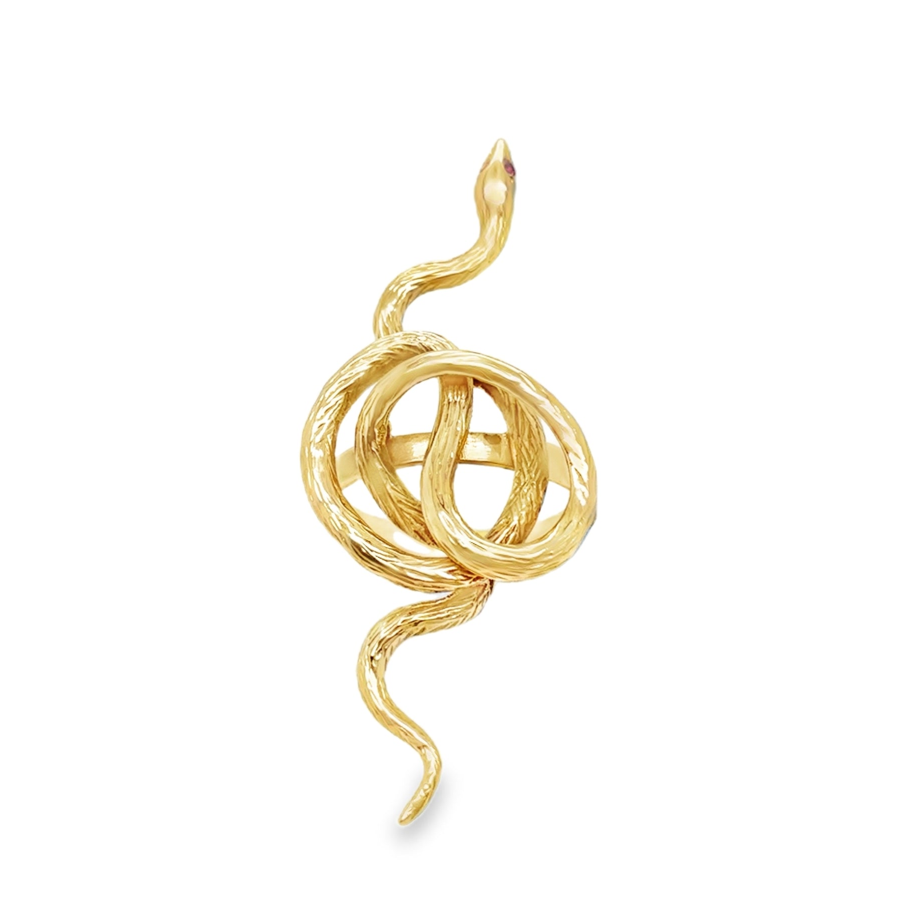 • This 18K yellow gold vintage snake ring features a delicate 0.02-carat ruby, showcasing refined craftsmanship and timeless design. Its sinuous form symbolizes wisdom and transformation, making it a meaningful accessory. Perfect for collectors and those seeking understated elegance with a touch of vibrant color.