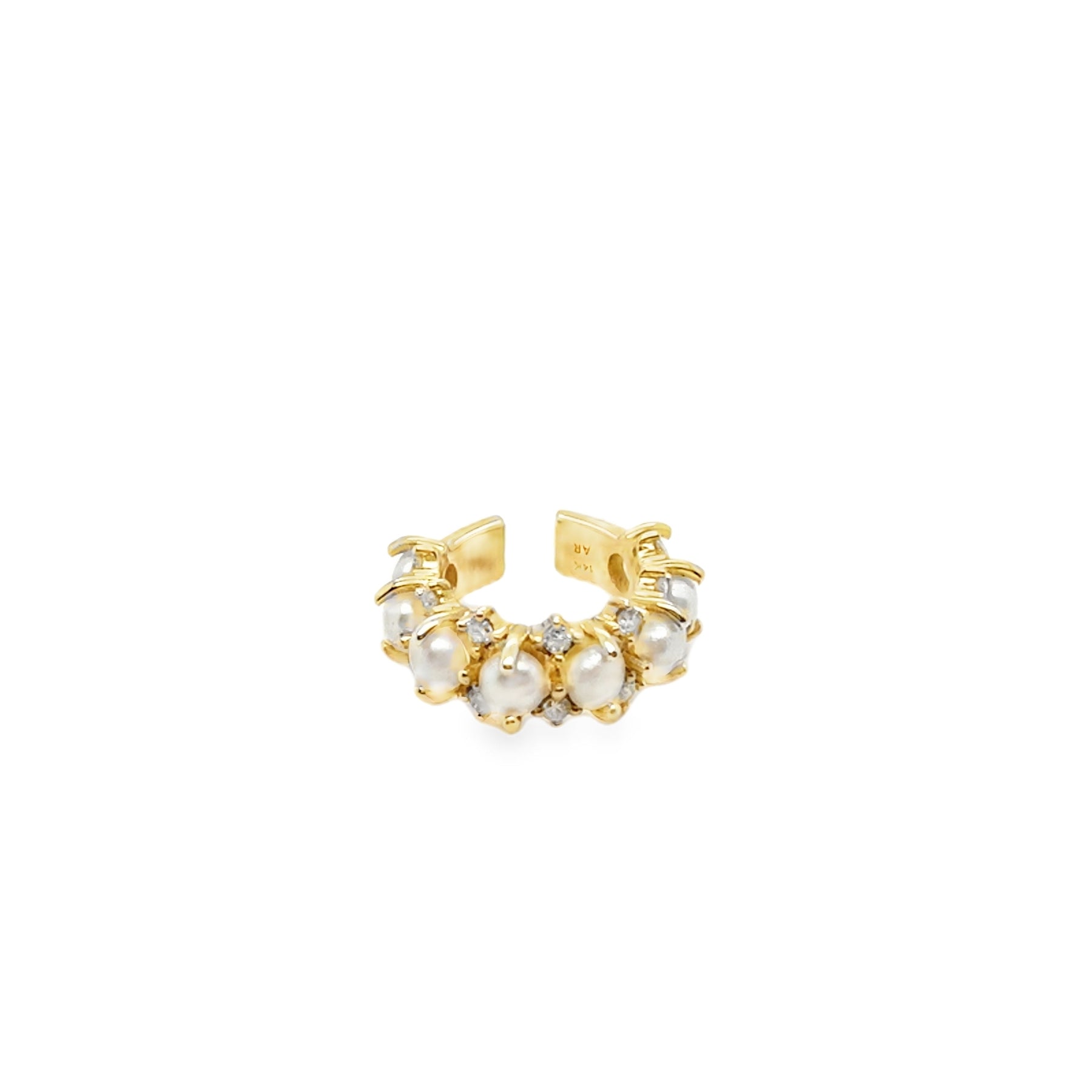A delicate ear cuff with vintage-meets-modern appeal. Crafted in 14K yellow gold, this cuff features a row of cultured pearls alternating with prong-set diamond accents — no piercing required. Slides onto the upper section of the ear for an instant elevated stack, and pairs beautifully with studs or hoops worn lower on the lobe.